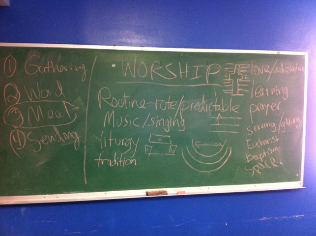 I opened the first class by writing “WORSHIP” on the board and inviting everyone to say what comes to mind when they hear the word. Here was the result of that discussion: