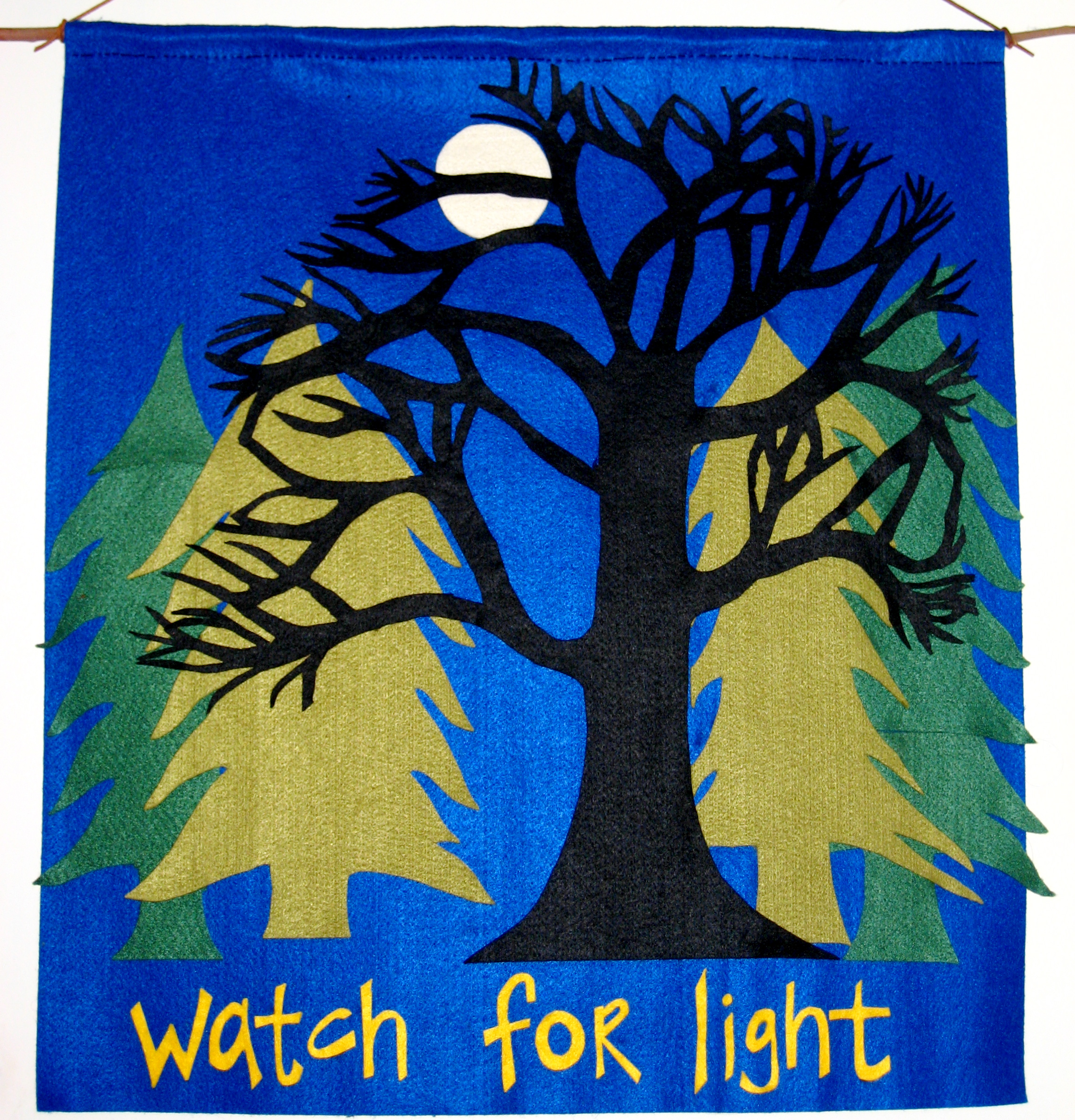 represent the Advent wreath. Consider how lighting can be used to create the effect of candles. This wreath was constructed out of corrugated plastic (the same stuff they make yard signs out of). - Advent banners can be cool. Don’t sell them short. They can add color and depth of meaning through the use of symbol and metaphor. Just search for “Advent banners”