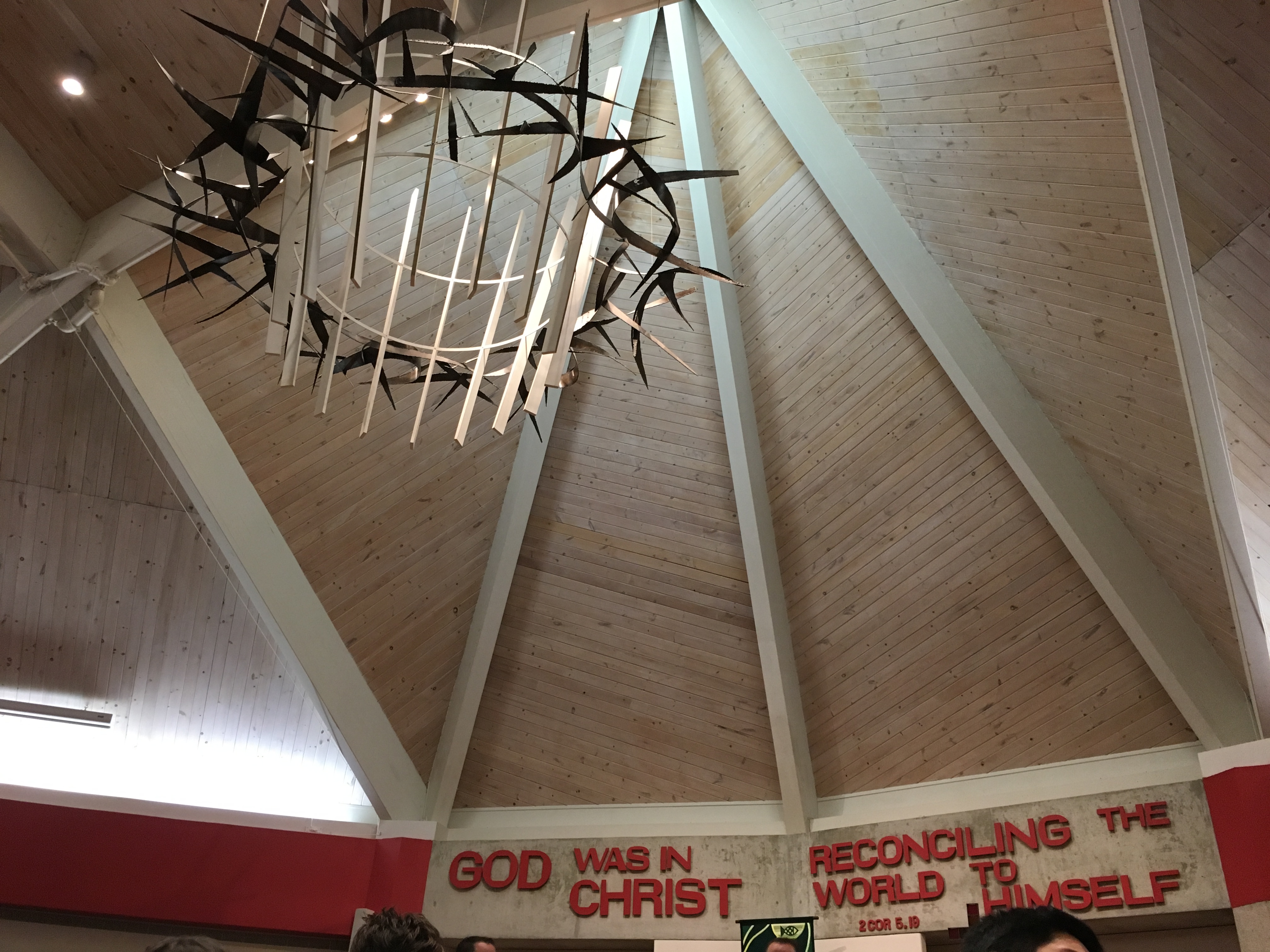 Next I noticed the object suspended in the air. What does this object represent to you? I can see several things. I could interpret this object as a crown of thorns, a circle of connecting crosses, or the wings of doves. Perhaps you see something different. Then I realized it. There was no cross in this room. At least there was no central, direct, grab-your-attention cross to tell you that this room was used for Christian worship.